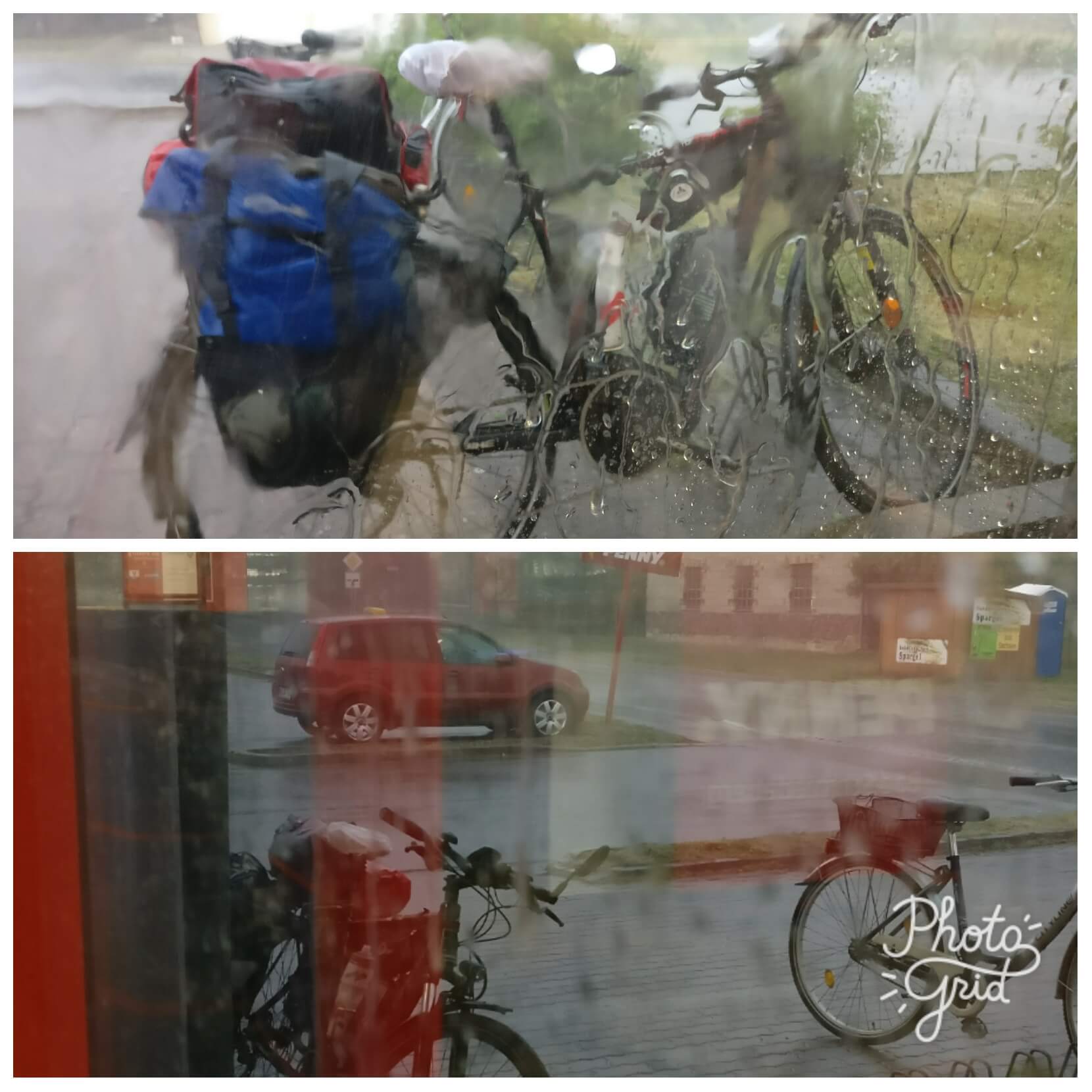 Hatte es gerade noch bis in einen Penny in Bad Schmiedeberg geschafft und dann ging es auch schon los mega Windboen, heftiger Hagel und Gewitter.